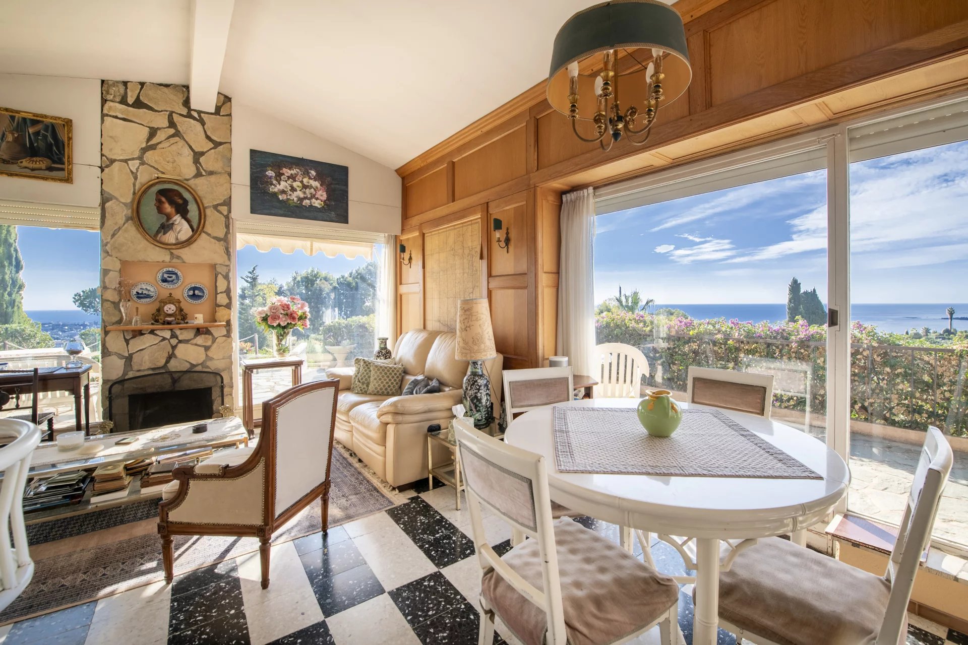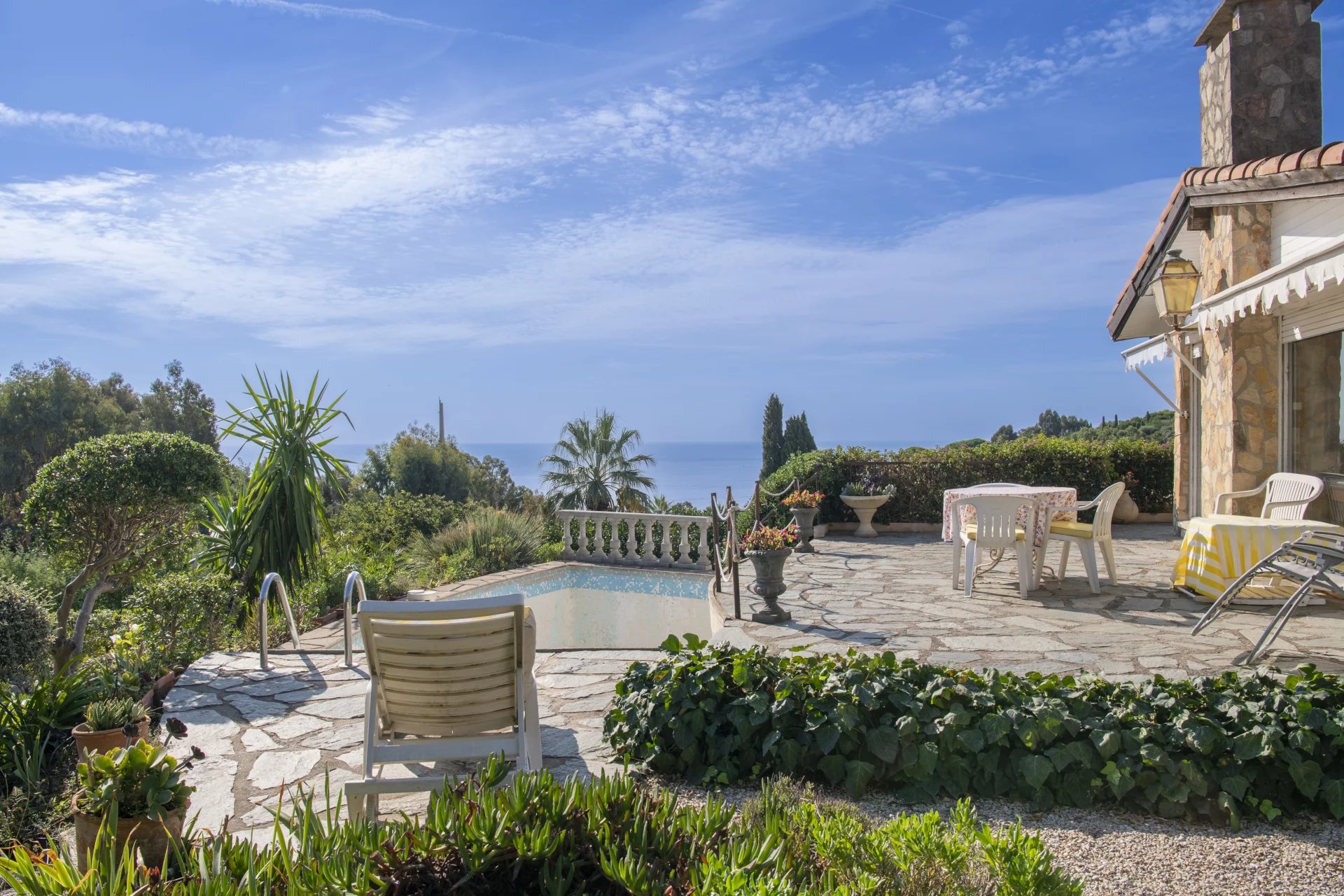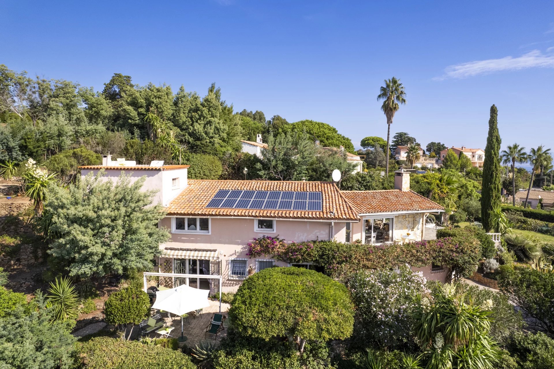 in a privileged and absolutely peaceful location, this villa boasts panoramic sea views over the bay of Golfe Juan and Cap d'Antibes.