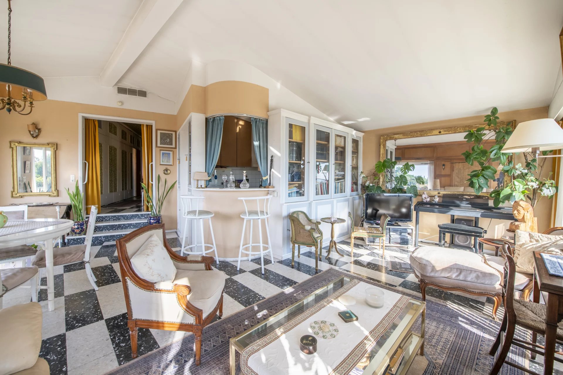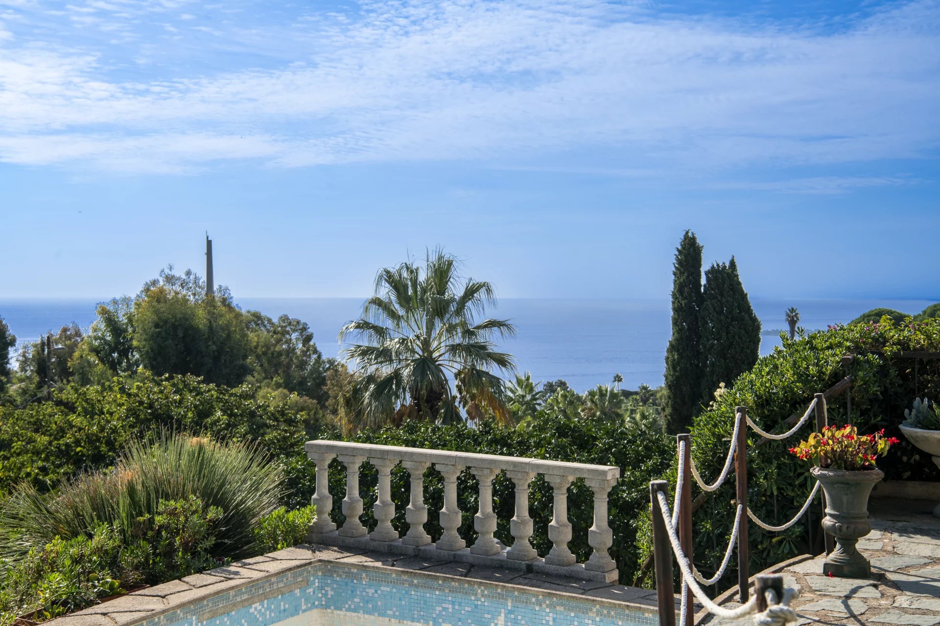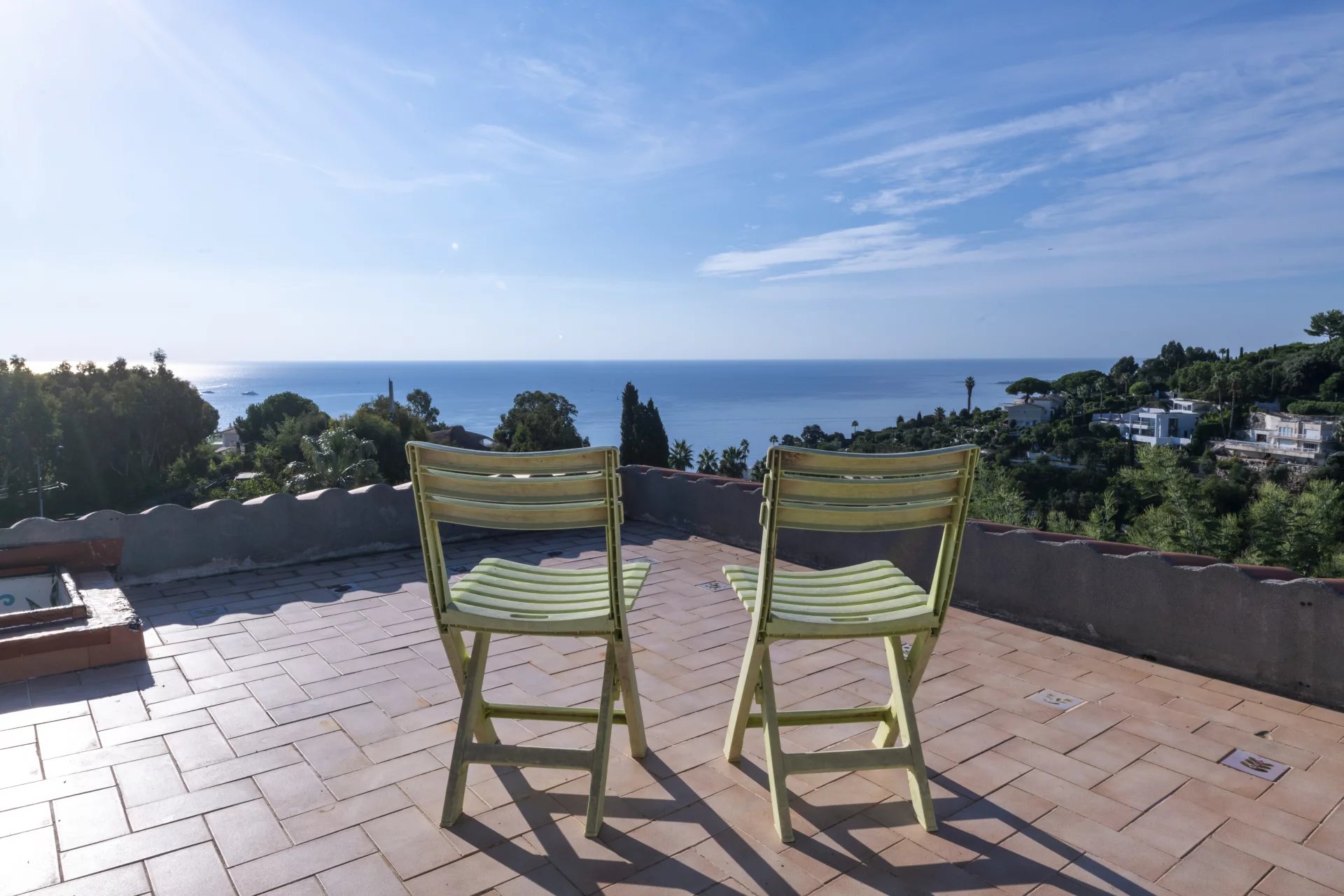 in a privileged and absolutely peaceful location, this villa boasts panoramic sea views over the bay of Golfe Juan and Cap d'Antibes.